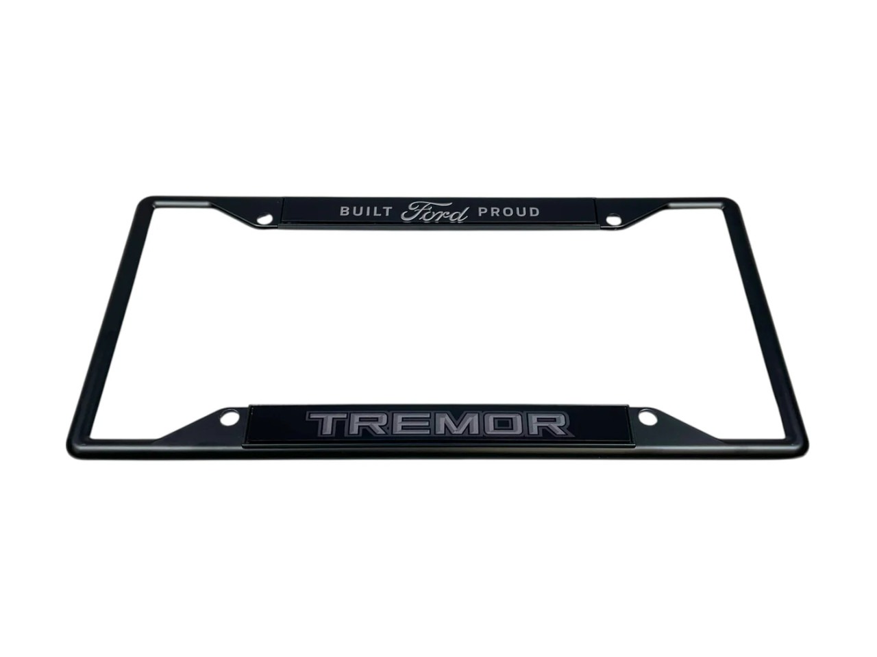 Built Ford Proud Tremor Black License Plate Frame with Dark Logo featuring the Built Ford Proud on the top and the Tremor logo at the bottom. This frame is a 4 hole style.